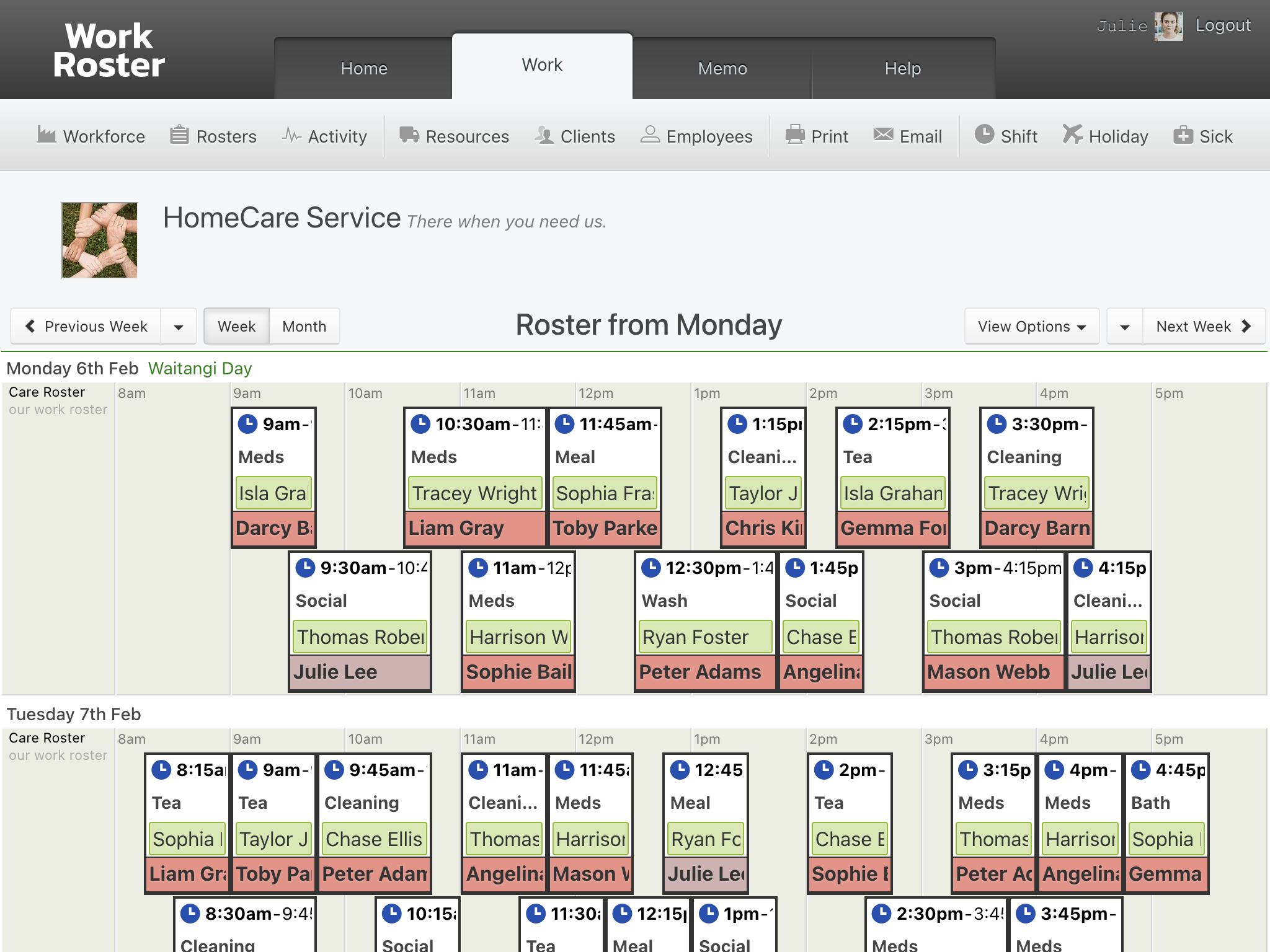 WorkRoster also supports many shift types, from short visits to overnight stays. And with our easy-to-use system, you can clearly see that all of your shifts are covered, without the need to assign shifts to individual employees.